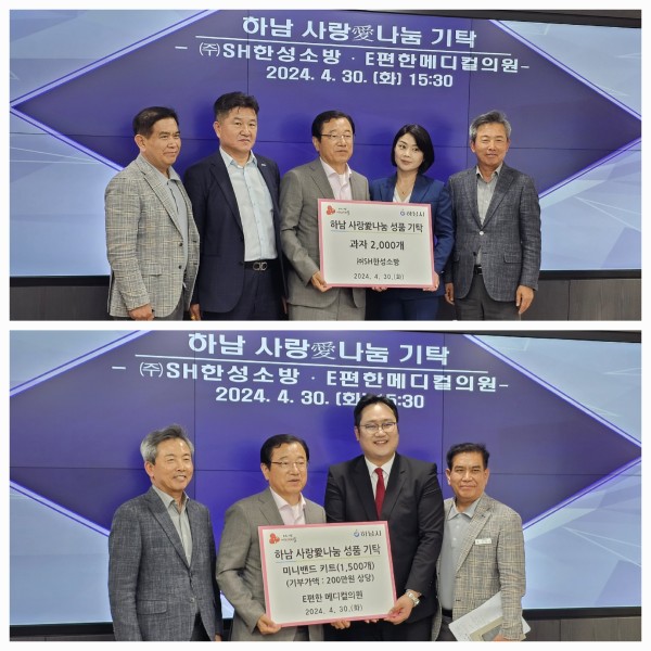 4월 30일, (주)SH한성소방에서 과자 2,000개 / E편한 메디컬의원에서 미니밴드 키드 1,500개를 '하남 사랑愛나눔 기탁'을 통해 하남시민생안정후원회에 지정기탁을 하였습니다.