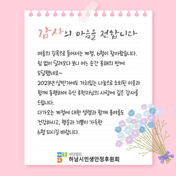 6월의 감사편지 게시글 작성정보 작성자 하남시민생안정후원회 작성일 23-06-01 10:00 조회수 627 댓글수 0 목록 게시글 본문 6월의 감사편지 첨부파일 1개 6월-감사편지-001.png (341.4K) 0회 다운로드 첨부일시 : 2023-06-01 10:00:00 이전글 7월의 감사편지 23-07-18 다음글 10월의 감사편지 22-11-03 댓글 0 등록된 댓글이 없습니다. 목록