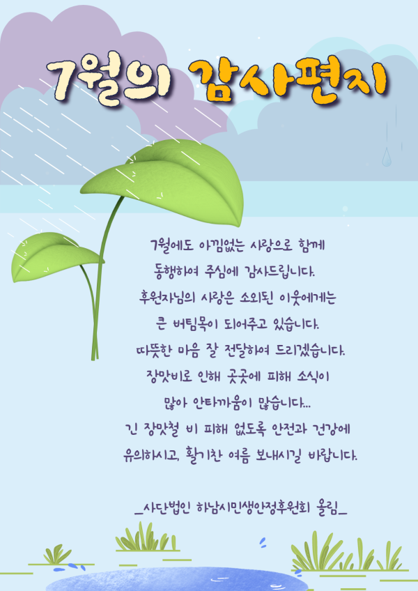 7월의 감사편지 게시글 작성정보 작성자 하남시민생안정후원회 작성일 23-07-18 17:02 조회수 678 댓글수 0 목록 게시글 본문 7월의 감사편지 첨부파일 1개 7월의 감사편지.png (538.2K) 0회 다운로드 첨부일시 : 2023-07-18 17:02:11 이전글 8월의 감사편지 23-08-31 다음글 6월의 감사편지 23-06-01 댓글 0 등록된 댓글이 없습니다. 목록