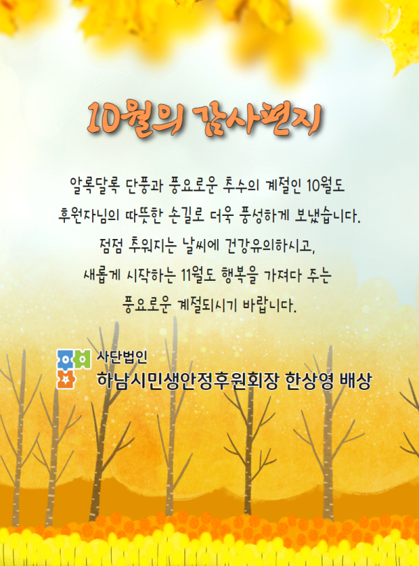 10월의 감사편지 게시글 작성정보 작성자 하남시민생안정후원회 작성일 23-10-30 17:40 조회수 626 댓글수 0 목록 게시글 본문 10월의 감사편지 첨부파일 1개 10월의 감사편지 2.png (1.2M) 0회 다운로드 첨부일시 : 2023-10-30 17:40:05 이전글 11월의 감사편지 23-11-29 다음글 9월 추석 감사카드 23-09-27 댓글 0 등록된 댓글이 없습니다. 목록