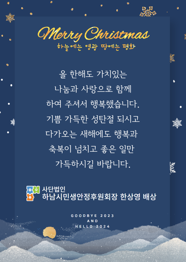 크리스마스 카드 게시글 작성정보 작성자 하남시민생안정후원회 작성일 23-12-23 11:33 조회수 527 댓글수 0 목록 게시글 본문 크리스마스 카드 첨부파일 1개 크리스마스카드.png (758.8K) 0회 다운로드 첨부일시 : 2023-12-23 11:33:00 이전글 2024년 연하장 24-01-01 다음글 11월의 감사편지 23-11-29 댓글 0 등록된 댓글이 없습니다. 목록