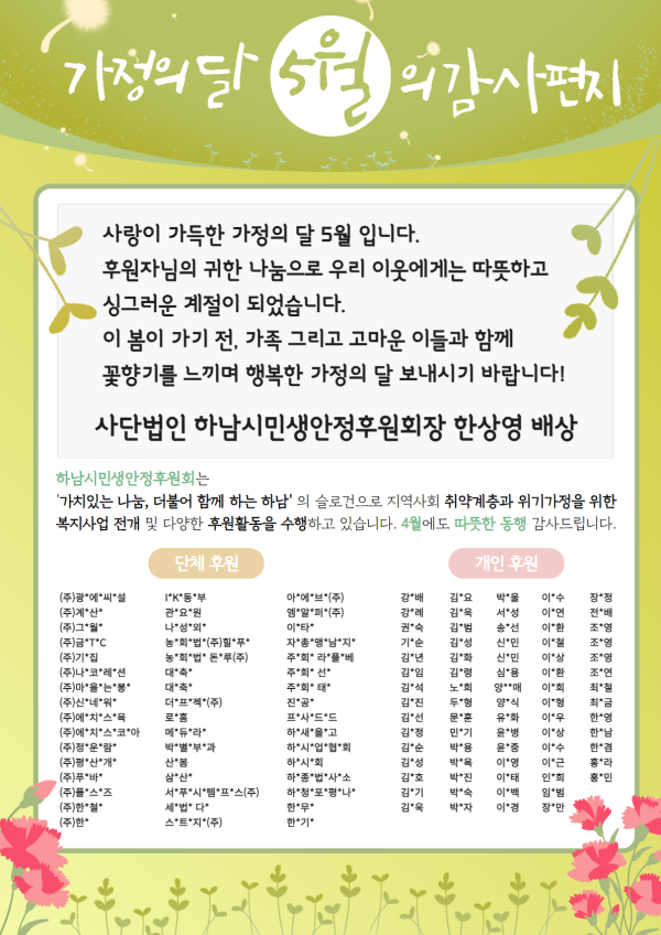 5월의 감사편지 게시글 작성정보 작성자 하남시민생안정후원회 작성일 24-05-02 09:47 조회수 421 댓글수 0 목록 게시글 본문 행복한 동행 4월 후원자 명단 첨부파일 1개 5월의 감사편지.png (527.9K) 0회 다운로드 첨부일시 : 2024-05-02 09:47:00 이전글 6월의 감사편지 24-06-07 다음글 4월의 감사편지 24-04-04 댓글 0 등록된 댓글이 없습니다. 목록