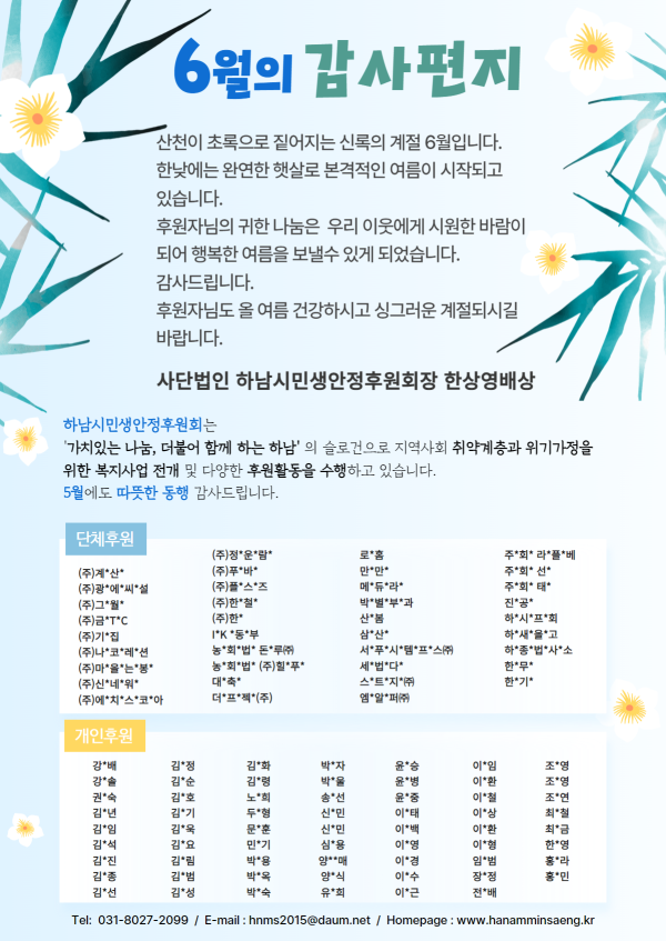 6월의 감사편지 게시글 작성정보 작성자 하남시민생안정후원회 작성일 24-06-07 13:09 조회수 373 댓글수 0 목록 게시글 본문 6월의 감사편지 첨부파일 1개 6월의 감사편지.png (765.5K) 0회 다운로드 첨부일시 : 2024-06-07 13:09:00 이전글 7월의 감사편지 24-07-01 다음글 5월의 감사편지 24-05-02 댓글 0 등록된 댓글이 없습니다. 목록