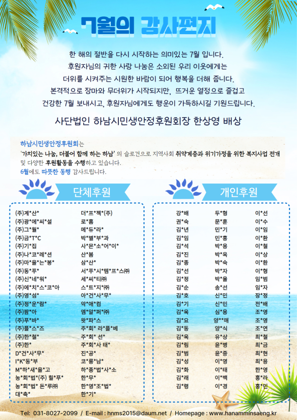 7월의 감사편지 게시글 작성정보 작성자 하남시민생안정후원회 작성일 24-07-01 17:53 조회수 222 댓글수 0 목록 게시글 본문 7월의 감사편지/6월 후원명단 첨부파일 1개 7월의 감사편지 2.png (2.0M) 0회 다운로드 첨부일시 : 2024-07-01 17:53:52 이전글 8월의 감사편지 24-08-01 다음글 6월의 감사편지 24-06-07 댓글 0 등록된 댓글이 없습니다. 목록