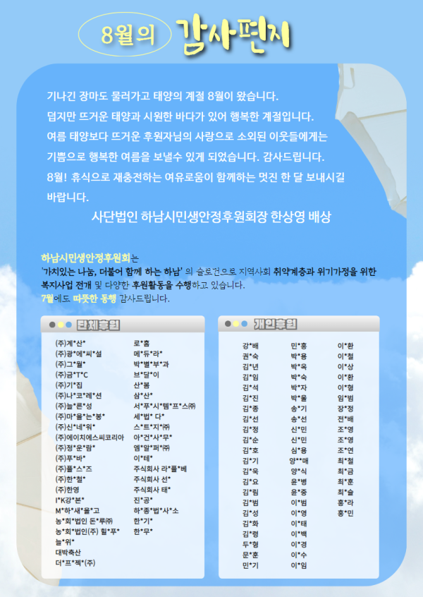 8월의 감사편지 게시글 작성정보 작성자 하남시민생안정후원회 작성일 24-08-01 15:32 조회수 213 댓글수 0 목록 게시글 본문 8월의 감사편지 첨부파일 1개 8월의 감사편지.png (560.7K) 0회 다운로드 첨부일시 : 2024-08-01 15:32:00 이전글 9월의 감사편지 24-09-02 다음글 7월의 감사편지 24-07-01 댓글 0 등록된 댓글이 없습니다. 목록
