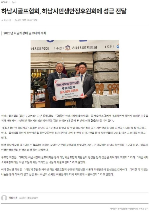 하남시골프협회, 2023년 하남시장배골프대회를 통해 하남시민생안정후원회에 성금 기탁