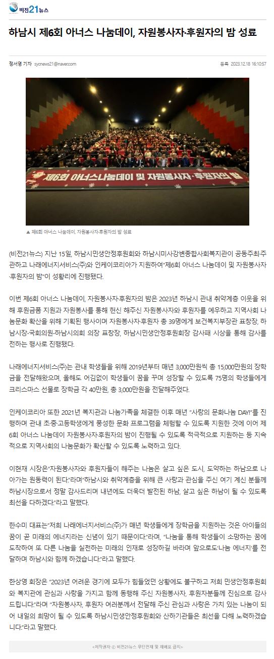 하남시 제6회 아너스 나눔데이, 자원봉사자·후원자의 밤 성료 게시글 작성정보 작성자 하남시민생안정후원회 작성일 23-12-18 17:18 조회수 811 댓글수 0 목록 게시글 본문 제6회 아너스나눔데이 첨부파일 1개 언론보도.JPG (156.2K) 0회 다운로드 첨부일시 : 2023-12-18 17:18:00 관련링크 1개 http://www.vision21.kr/mobile/article.html?no=317682 0회 연결 이전글 하남시기업인협의회, 취약계층 지원을 위한 후원금 기탁 23-12-20 다음글 이봉덕 후원자, 폐지 수집으로 모은 돈 저소득층 학생 장학금으로 기탁 23-12-15 댓글 0 등록된 댓글이 없습니다. 목록
