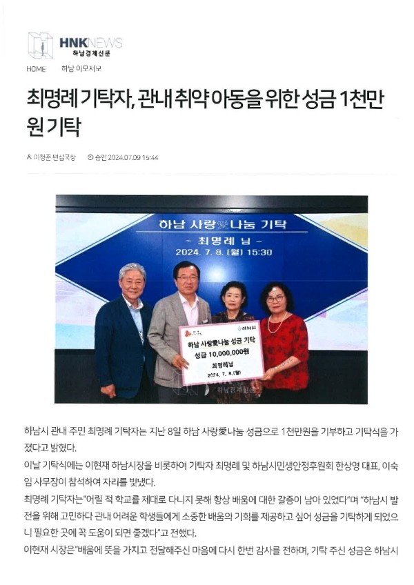 최명례 기탁자, 관내취약계층 아동을 위한 성금 기탁 게시글 작성정보 작성자 하남시민생안정후원회 작성일 24-07-10 14:28 조회수 365 댓글수 0 목록 게시글 본문 www.hakyungnews.co.kr/news/articleView.html?idxno=4578 첨부파일 2개 20240715142902_1.jpg (168.7K) 0회 다운로드 첨부일시 : 2024-07-10 14:28:00 20240715142902_2.jpg (38.3K) 0회 다운로드 첨부일시 : 2024-07-10 14:28:00 관련링크 1개 http://www.hakyungnews.co.kr/news/articleView.html?idxno=4578 1회 연결 이전글 희망찬지역아동센터 냉방기 후원금 전달 24-08-13 다음글 하남시골프협회, 취약계층 지원을 위한 성금전달 24-06-03 댓글 0 등록된 댓글이 없습니다. 목록