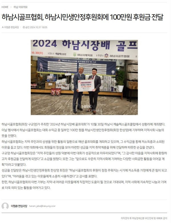 하남시골프협회, 하남시민생안정후원회에 100만원 후원금 전달 게시글 작성정보 작성자 하남시민생안정후원회 작성일 24-11-04 17:57 조회수 326 댓글수 0 목록 게시글 본문 http://www.hakyungnews.co.kr/news/articleView.html?idxno=4824 첨부파일 1개 하남시골프협회 후원금전달100만원.JPG (154.6K) 0회 다운로드 첨부일시 : 2024-11-04 17:57:34 관련링크 1개 http://www.hakyungnews.co.kr/news/articleView.html?idxno=4824 0회 연결 이전글 하남시기업인협의회, 사랑의 김장나눔 24-11-14 다음글 왓썹파닉스, 필리핀 세부 놀이터건립 후원금 전달 24-08-28 댓글 0 등록된 댓글이 없습니다. 목록