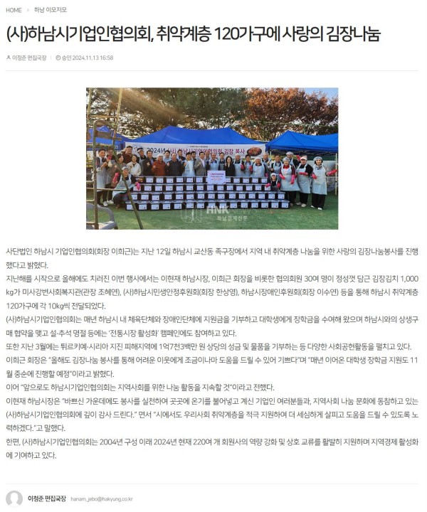 하남시기업인협의회에서 사랑의 김장나눔으로 하남시민생안정후원회, 하남시미사강변종합사회복지관, 하남시장애인후원회를 통해 취약계층 120가구에 전달되었다.