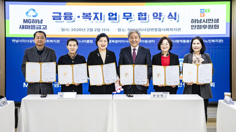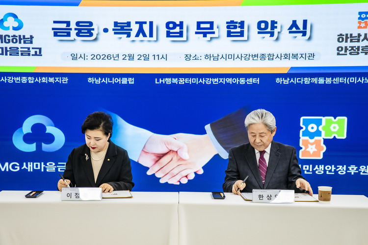 MG하남새마을금고와 하남시민생안정후원회는 지난 2일 미사강변복지관 강당에서 업무협약(MOU)을 맺고 지역사회 복지 종사자와 이용자를 위한 금융 편의 확대 및 상생 협력을 다짐했다. 이번 협약은 MG하남새마을금고가 지난 4월 지방보조금(보탬e) 취급 기관으로 선정된 것을 계기로 추진됐다.
