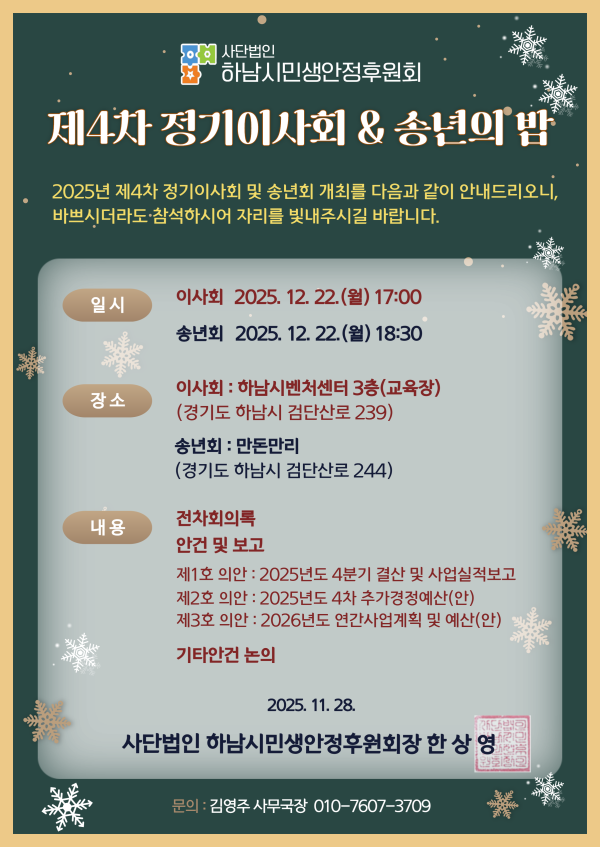 2025년 제4차 정기이사회 공고 게시글 작성정보 작성자 하남시민생안정후원회 작성일 25-12-10 14:54 조회수 27 댓글수 0 목록 게시글 본문 첨부파일 1개 2025년 제4차 정기이사회 및 송년회.png (1.0M) 0회 다운로드 첨부일시 : 2025-12-10 14:54:58 이전글 하남시다함께돌봄센터미사노인복지관 돌봄교사(시간제) 최종 합격자 발표 25-12-16 다음글 하남시다함께돌봄센터(미사노인복지관) 시간제교사 채용 1차 서류 전형 합격자 25-12-04 댓글 0 등록된 댓글이 없습니다. 목록
