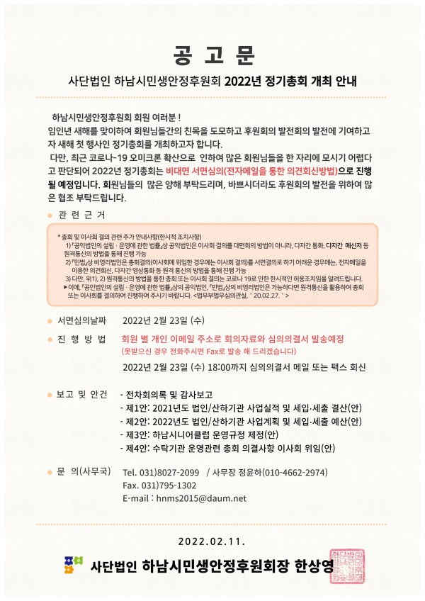 안녕하십니까 하남시민생안정후원회 사무국입니다.