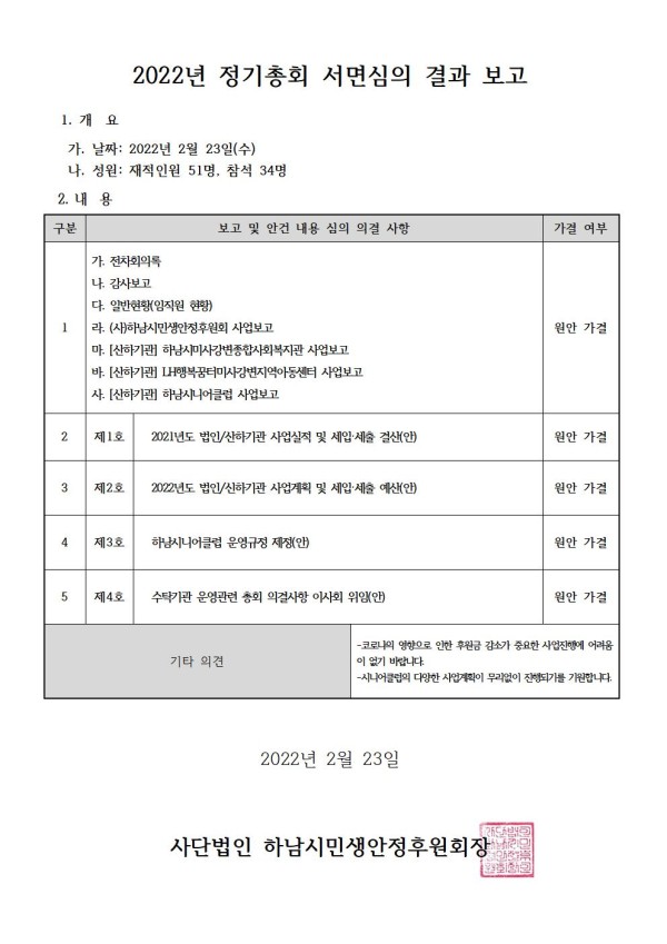 2022년 정기총회 서면심의 결과 보고 게시글 작성정보 작성자 하남시민생안정후원회 작성일 22-02-24 17:12 조회수 1,663 댓글수 0 목록 게시글 본문 2022년 정기총회 서면심의 결과 보고를 드립니다. 첨부파일 1개 심의의결서-총회결과보고.jpg (123.0K) 0회 다운로드 첨부일시 : 2022-02-24 17:12:48 이전글 [긴급] 하남시미사강변종합사회복지관 직원채용 공고 22-05-09 다음글 2022년 정기총회 자료 22-02-11 댓글 0 등록된 댓글이 없습니다. 목록