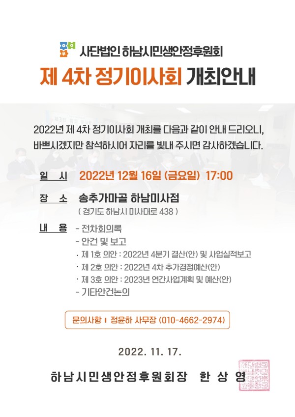 2022년 4차 정기이사회 개최 공지 게시글 작성정보 작성자 하남시민생안정후원회 작성일 22-12-01 11:20 조회수 1,192 댓글수 0 목록 게시글 본문 감사합니다 첨부파일 1개 2022년 4차 이사회공고문 3.jpg (483.3K) 0회 다운로드 첨부일시 : 2022-12-01 11:20:00 이전글 하남시미사강변종합사회복지관 직원채용 공고 23-01-09 다음글 2022년 3차 정기이사회 개최 공지 22-09-09 댓글 0 등록된 댓글이 없습니다. 목록