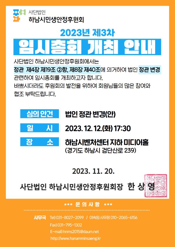 2023년 제3차 임시총회 개최 공고 게시글 작성정보 작성자 하남시민생안정후원회 작성일 23-11-20 15:14 조회수 849 댓글수 0 목록 게시글 본문 2023년 제3차 임시총회 첨부파일 1개 제3차 임시총회 공고문.png (224.1K) 0회 다운로드 첨부일시 : 2023-11-20 15:14:00 이전글 2023년 제4차 정기이사회 개최 & 송년회 안내 23-11-27 다음글 2023년 제3차 정기이사회 개최 23-09-06 댓글 0 등록된 댓글이 없습니다. 목록