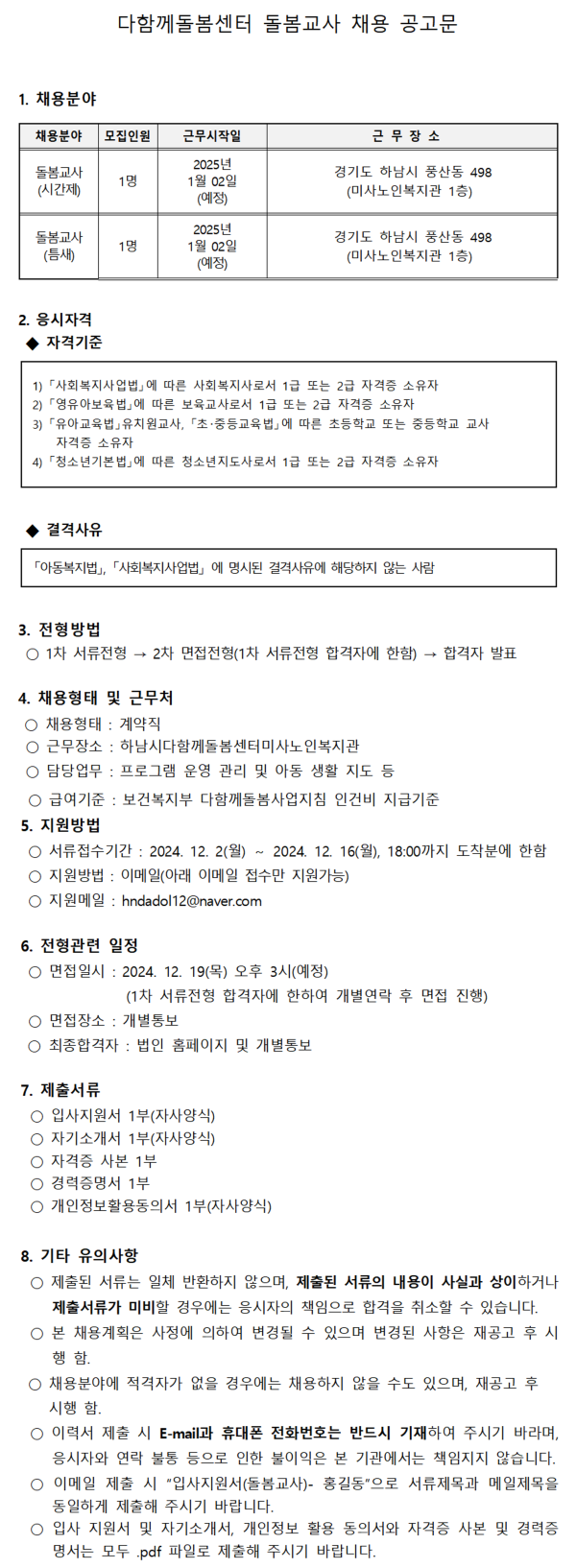 하남시다함께돌봄센터미사노인복지관 돌봄교사(시간제,틈새) 채용공고