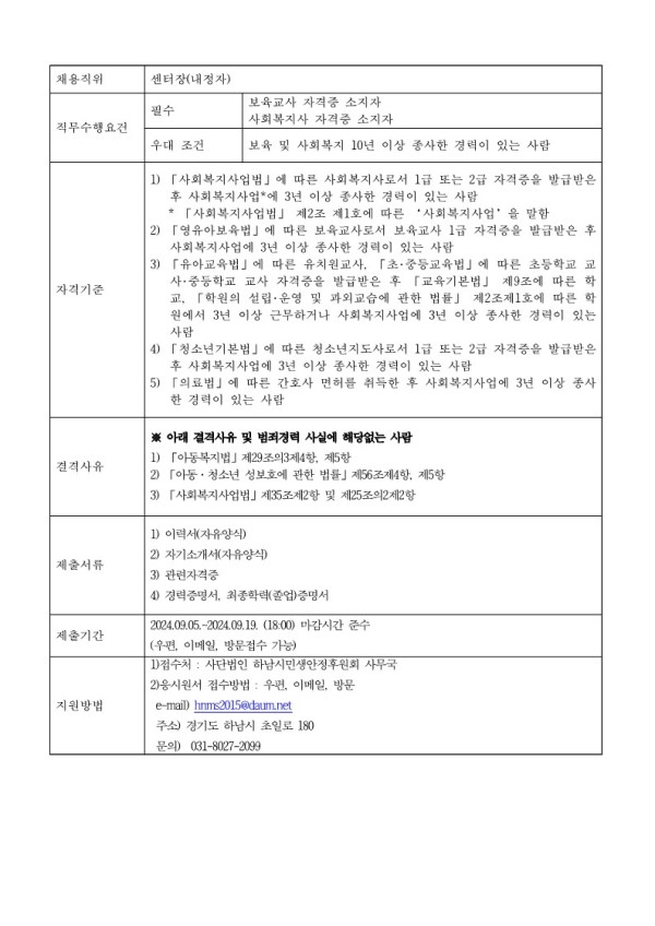 사단법인 하남시민생안정후원회에서는 하남시다함께돌봄센터(제2노인복지관)에서 근무할 센터장(내정자)을 공개모집 합니다.